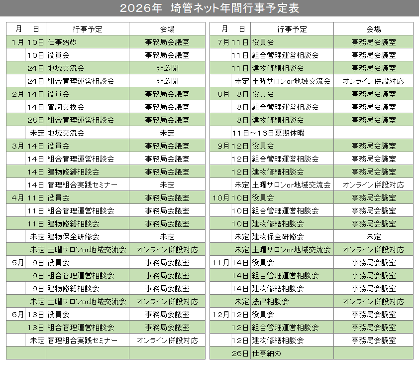 2026年![]() 本年もよろしくお願いいたします 2026年度 年間行事スケジュールを掲載しました。 (画像ファイル) 「マンションライフ」掲載しました 2025年8月 147号発行 マンションライフ画像をクリックすると閲覧できます。 ![]() 「マンションライフ」掲載しました 2025年5月 146号発行 マンションライフ画像をクリックすると閲覧できます。 ![]() 「マンションライフ」掲載しました 2025年1月 145号発行 マンションライフ画像をクリックすると閲覧できます。 ![]() 2025年度 年間行事スケジュールを掲載しました。 (画像ファイル) 「マンションライフ」掲載しました 2024年12月 144号発行 ![]() マンションlife情報マガジン 役立つ情報をお届けします。 ぜひ購読してください。 ●登録はこちらから マンションlife情報マガジン
